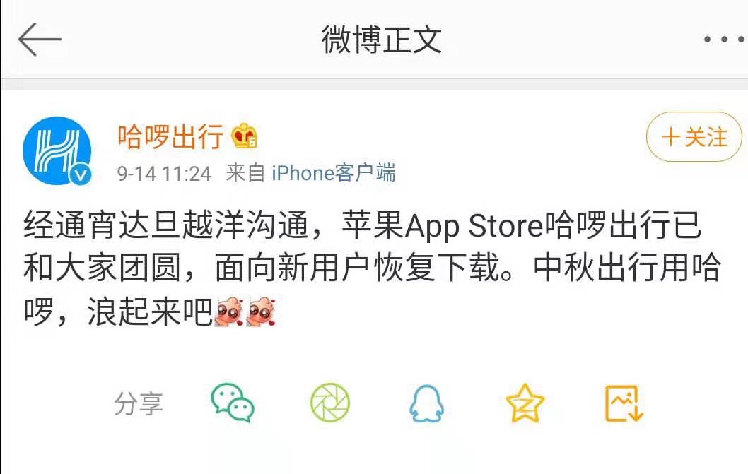三言财经 9月14日消息,今日午间,哈啰出行官方微博发文称,经过沟通,哈啰出行APP已经在苹果App Store重新上架,面向新用户恢复下载。
