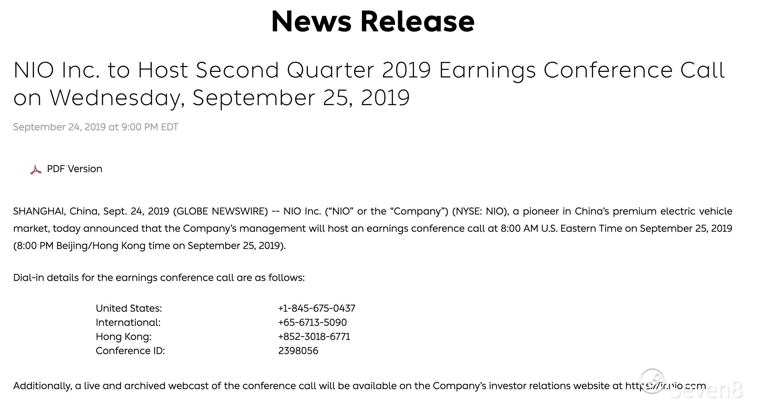 三言财经 9月25日消息 ,今日蔚来汽车发布公告,将于北京时间9月25日晚8点召开第二季度的业绩电话会议。昨日蔚来汽车发布了2019财年第二季度财报,并取消了原定于昨日举行的第二季度财报电话会议。