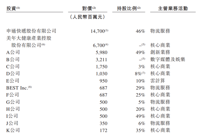 阿里巴巴在招股文件中透露,2019年6月30日以来,对23家公司进行了投资,其中,对申通快递投资147亿元,占股46%;对美年大健康投资67亿元;对百世物流投资68.7亿元,占股29%。