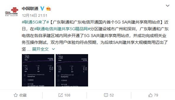 三言财经 12月15日消息,昨晚,中国联通通过官方微博消息,称广东联通和广东电信开通国内首个5G SA共建共享商用站点。