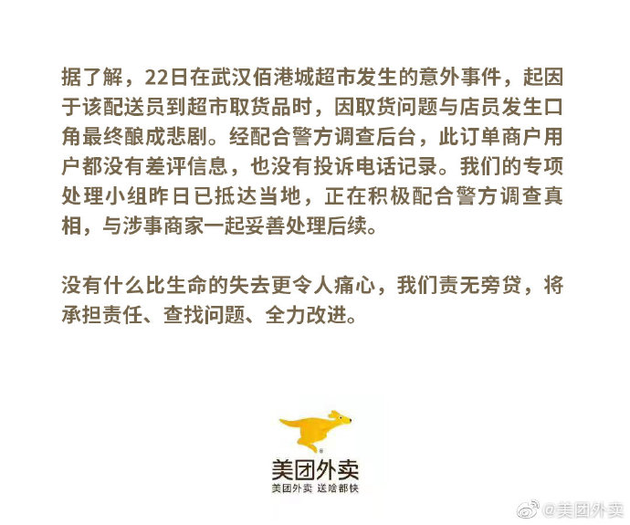 三言财经 12月23日消息,昨日,武汉美团外卖小哥持刀杀人致死事件引起热议,今日早间美团外卖发表声明称,事件起因于该配送员到超市取货时,因取货问题与店员发生口角最终酿成悲剧。经配合警方调查后台,此订单商户用户都没有差评信息,也没有投诉电话记录。