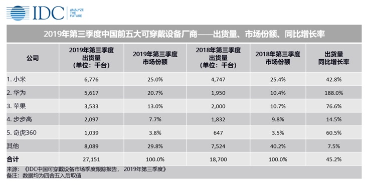 三言财经 12月25日消息,昨日IDC发布《中国可穿戴设备市场季度跟踪报告,2019年第三季度》,报告显示2019年Q3中国可穿戴设备市场出货量为2715万台,同比增长45.2%。小米、华为、苹果占据2019年Q3中国可穿戴设备市场出货量的前三位。