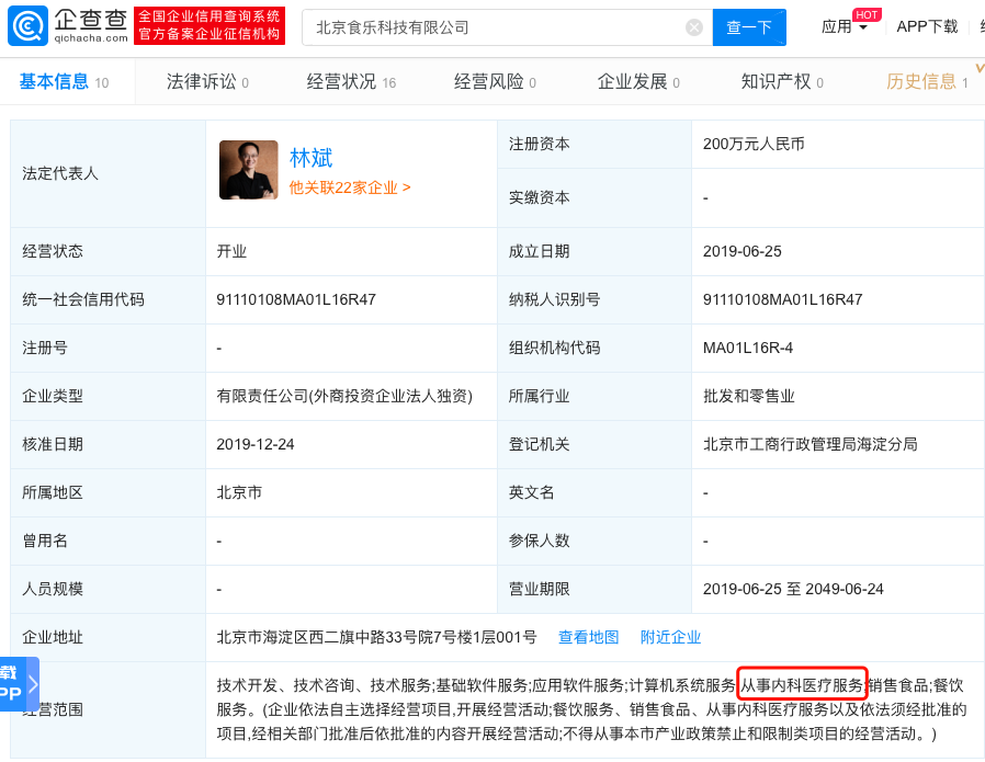 三言财经 12月25日消息,企查查数据显示,12月24日,北京食乐科技有限公司经营范围发生变更,新增“从事内科医疗服务”业务。该公司成立于2019年6月,注册资本200万人民币,法定代表人为小米联合创始人、总裁林斌,由小米通讯技术有限公司全资控股。