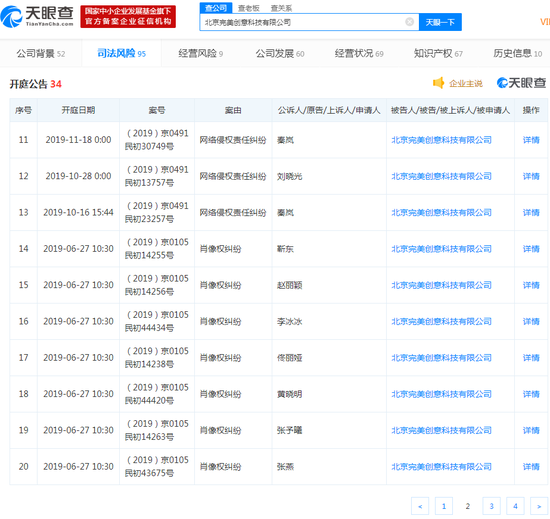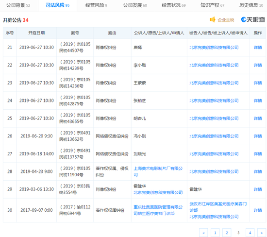 今年6月,曾因网络侵权责任纠纷被冯小刚、刘晓光起诉。仅6月27日一天,胡杏儿、张柏芝、王蒙蒙、李小璐、唐嫣、张燕、张予曦、黄晓明、佟丽娅、李冰冰、赵丽颖、靳东等12位演员与北京完美创意科技有限公司的肖像权纠纷同日开庭。