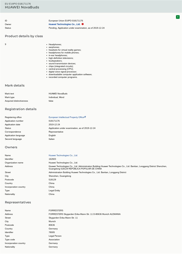 三言财经 12月27日消息,近日,华为向EUIPO(欧盟专利局)申请HUAWEI NovaBuds商标,商标ID为EUIPO 018171176,该商标隶属耳机种类。HUAWEI NovaBuds用途包括:虚拟现实游戏增强耳机、手机耳机、入耳耳机等,目前该商标尚处于等待审核过程。