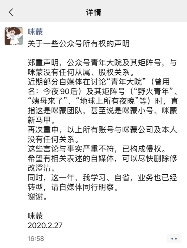 三言财经 2月27日消息,今日,咪蒙在微信朋友圈发布声明,称公众号“青年大院”及其矩阵号与咪蒙公司及其本人没有任何从属、股权关系。这些言论与事实严重不符,已构成侵权,希望有相关表述自媒体可以尽快删除修改澄清。