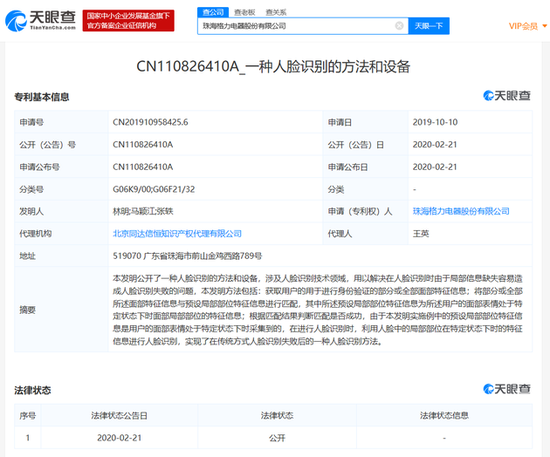 三言财经 2月28日消息,天眼查专利数据显示,近日,格力电器的运营主体珠海格力电器股份有限公司于去年10月申请的“一种人脸识别的方法和设备”专利被公布,授权状态未知。