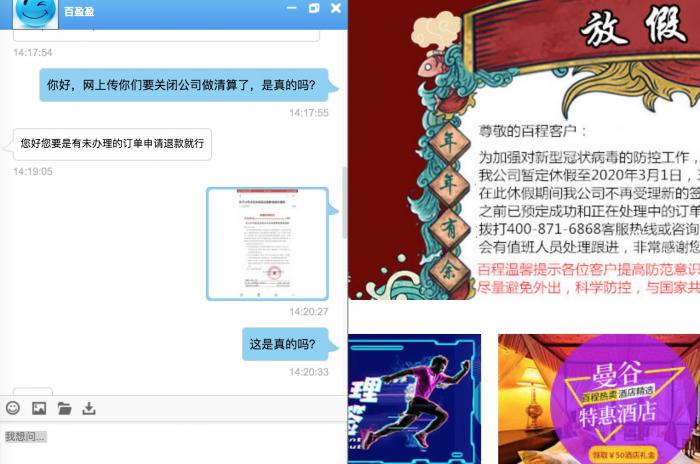 另据21世纪经济报道消息,百程旅行网值班客服证实上述消息属实,百程旅行网确实决定关闭公司业务,目前值班客服留守热线和网上帮助乘客处理退款退订事宜。