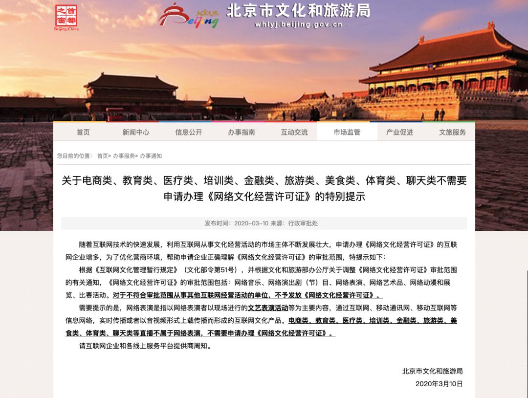 三言财经 3月11日消息,北京市文化和旅游局3月10日在官网发布特别提示,明确电商类、教育类、医疗类、培训类、金融类、旅游类、美食类、体育类、聊天类等直播不属于网络表演,不需要申请办理《网络文化经营许可证》。
