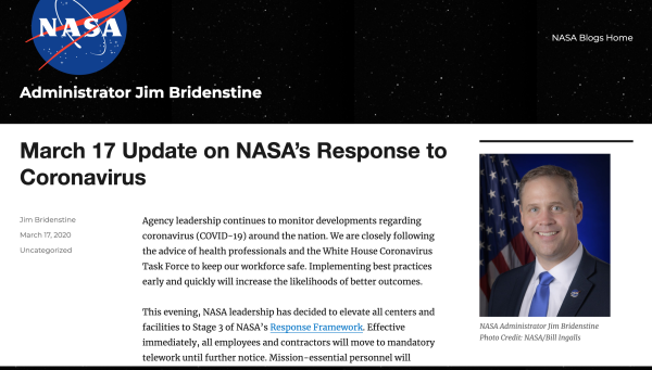 NASA局长吉姆·布里登斯廷在官网一份声明中表示,“尽管有限数量的员工检测出COVID-19呈阳性,但我们必须采取这一先发制人的行动,阻止病毒在员工和社区中进一步传播。”