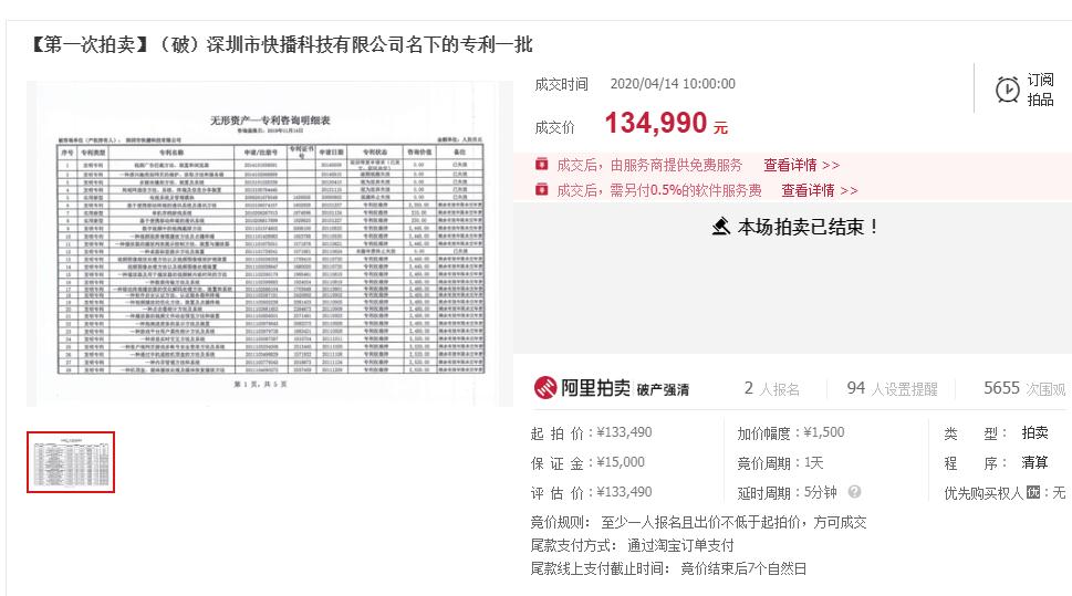 以及深圳市快播科技有限公司名下的专利一批,其中有54项专利处于剩余有效年限未交年费状态,剩余专利状态已失效。评估价和起拍价为133490元。