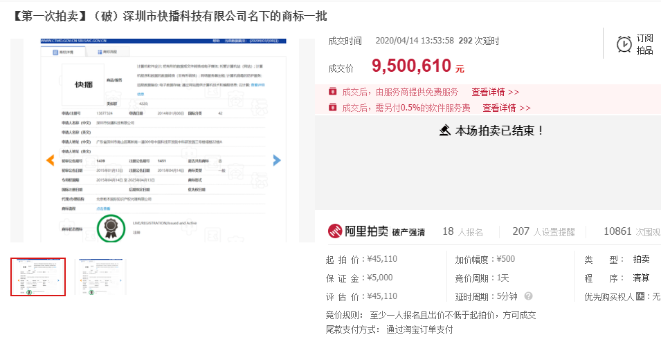 最终,专利经过两次竞买,以134990元的价格在14日上午10点拍卖成交;商标经过402次竞买,以9500610元的价格在下午13:53成交。