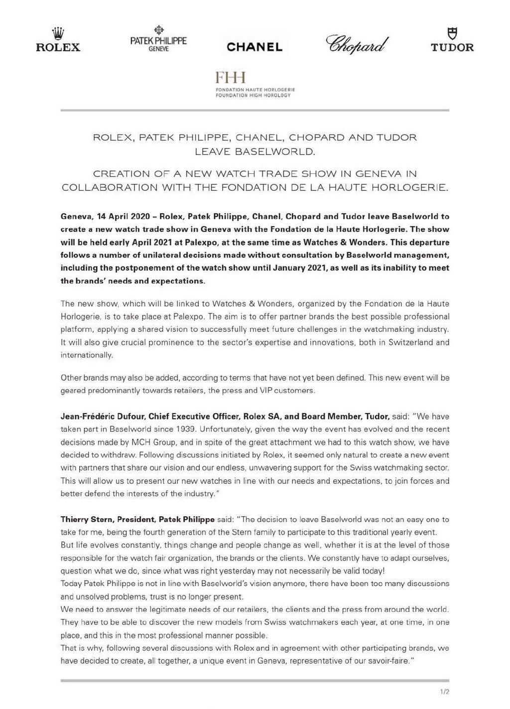 三言财经 4月14日消息,百达翡丽、劳力士、帝舵、香奈儿以及萧邦宣布将离开巴塞尔表展(Baselworld),并与瑞士高级制表基金会(FHH)合作创办新的表展。此新表展将于明年2021年日内瓦高级钟表展(Watches & Wonders)同期时间举行。