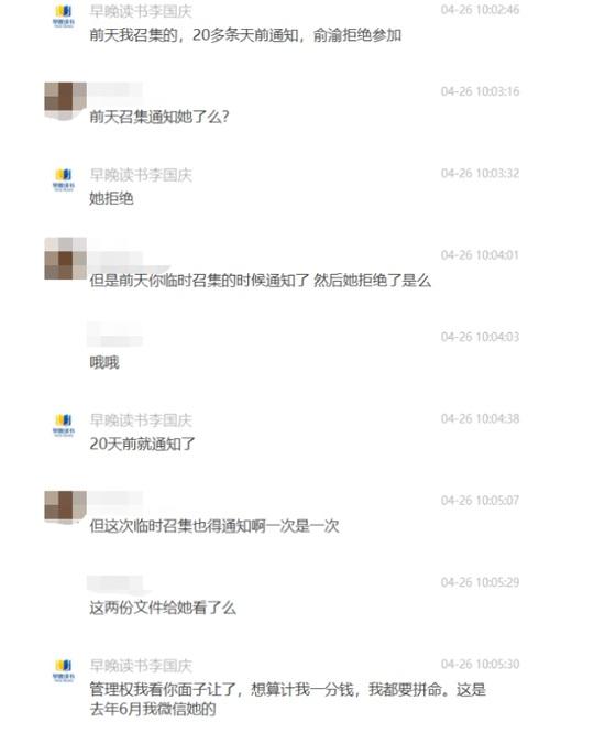 三言财经 4月27日消息,4月26日晚间,李国庆晒出4月26日上午与儿子微信聊天记录。在聊天中,李国庆称自己20多天前已通知俞渝准备召开股东大会,但俞渝拒绝参加。李国庆希望儿子充当调解人的角色,因为俞渝估计只能听进儿子的话。