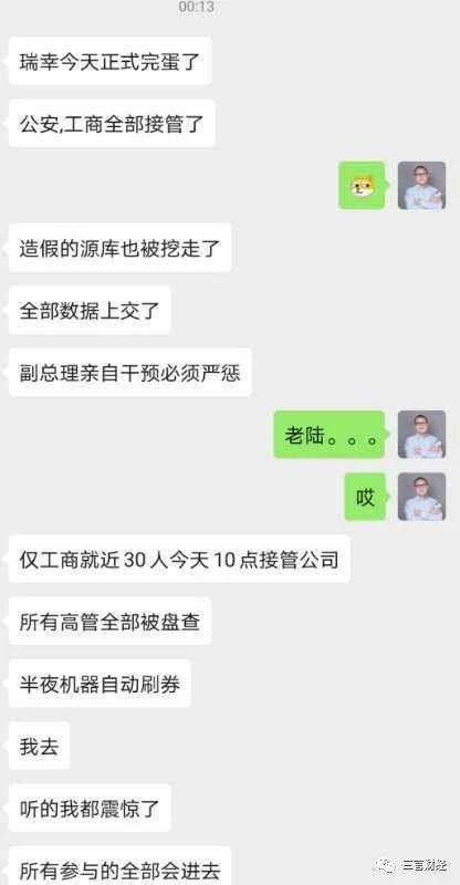 此前流传的一份截图显示,瑞幸咖啡被公安、工商全部接管,造假库源被挖走,全部数据上交。