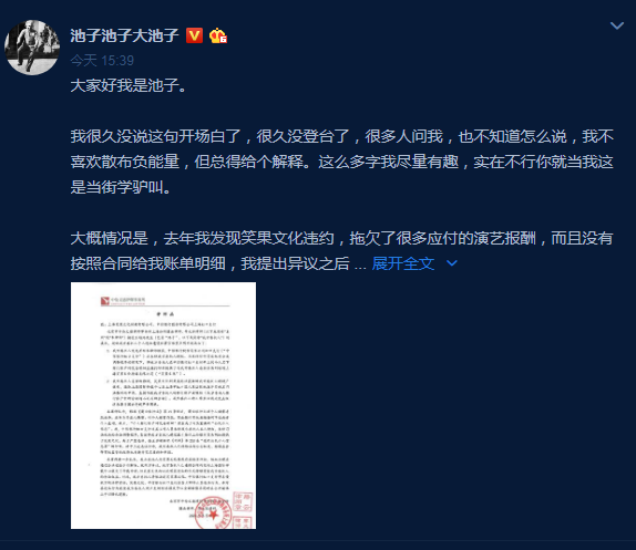 池子表示:“去年(2019年)我发现笑果文化违约,拖欠了很多应付的演艺报酬,而且没有按照合同给我账单明细,我提出异议之后,笑果基本上刻意停止了我的一切工作,我多次提出和平解约,笑果不同意,我只能提出仲裁,让他们付清我的报酬。然后笑果文化也提出仲裁,让我赔给他们3000多万。”