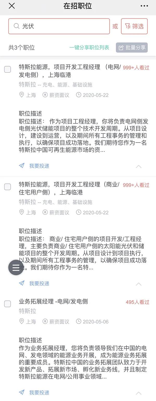 三言财经 5月25日消息,特斯拉中国新增了3个招聘信息,都与能源和项目开发工程管理有关。根据职位描述,员工将会负责电网发电和光伏储能项目,或者负责商业和住宅用户方面的太阳能光伏和储能项目开发。