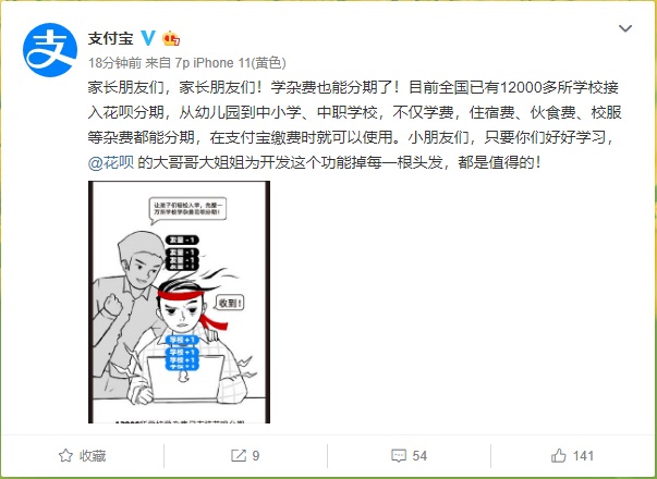 三言财经 5月25日消息,支付宝官方微博今天上午宣布,学杂费也能分期了。目前全国已有12000多所学校接入花呗分期,从幼儿园到中小学、中职学校,不仅学费,住宿费、伙食费、校服等杂费都能分期,在支付宝缴费时就可以使用。