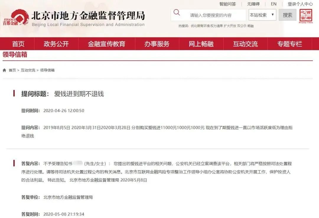 针对提问,今年5月8日,北京市地方金融监督管理局答复的“不予受理告知书”内容指出:“您提出的爱钱进平台的相关问题,公安机关已经立案调查该平台,相关部门将严格按照司法处置程序进行处理。请等待司法机关处置过程公布的有关消息。北京市互联网金融风险专项整治工作领导小组办公室将协助公安机关开展工作,保护投资人的合法利益。”。