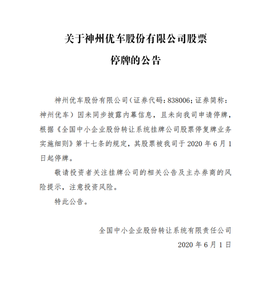 三言财经6月1日消息,全国中小企业股份转让系统有限责任公司公告称,神州优车因未同步披露内幕信息,且未申请停牌,其股票6月1日起被停牌。