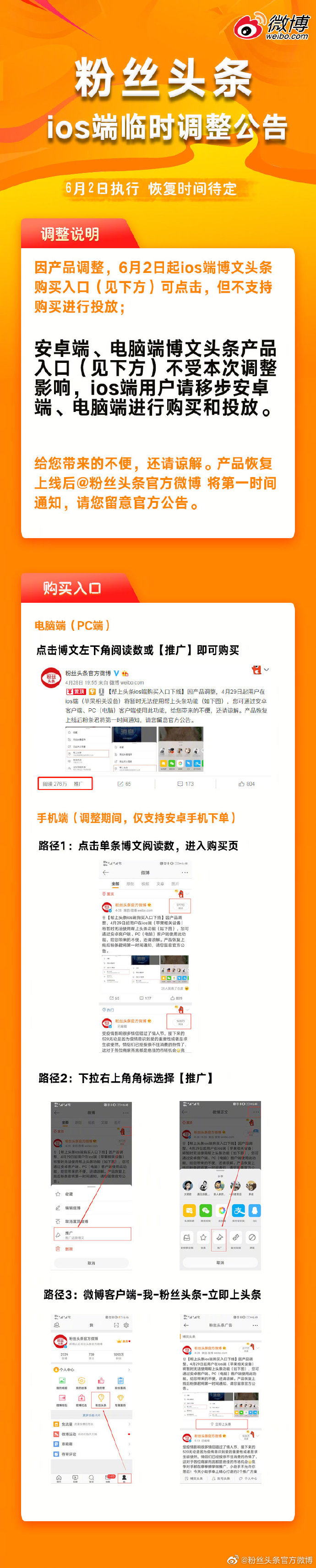 2、安卓端、电脑端博文头条产品不受本次调整影响,ios端用户请移步安卓端、电脑端进行购买和投放(购买入口见长图)