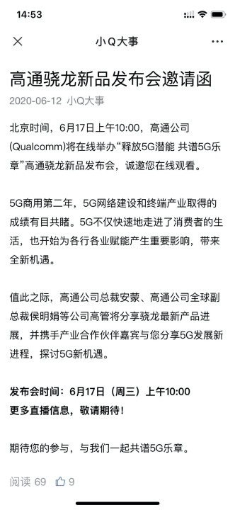 三言财经 6月12日消息,今日高通官方宣布,将于北京时间 6 月 17 日上午 10:00 举办高通骁龙新品发布会。此次发布会上高通公司总裁安蒙、高通公司全球副总裁侯明娟等公司高管将分享骁龙最新产品进展。