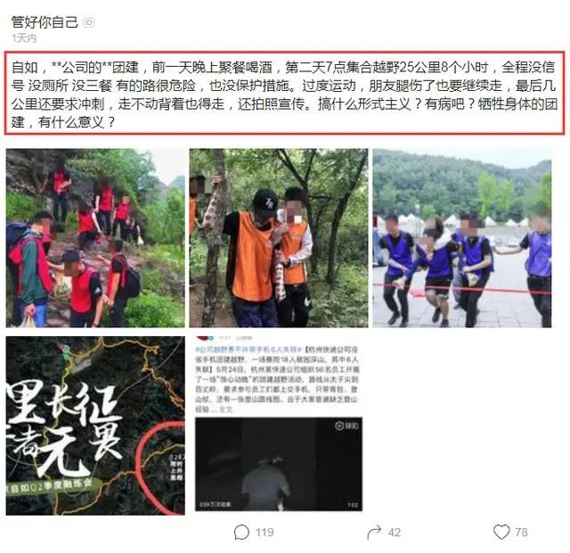 三言财经 6月12日消息,今日,在社交媒体上,一位疑似自如员工的用户发文称,自如,公司的团建,前一天晚上聚餐喝酒,第二天7点集合越野25公里8个小时,全程没信号、没厕所、没三餐,有的路很危险,也没保护措施。过度运动,朋友腿伤了也要继续走,最后几公里还要求冲刺,走不动背着也得走,还拍照宣传。搞什么形式主义?有病吧?牺牲身体的团建,有什么意义?