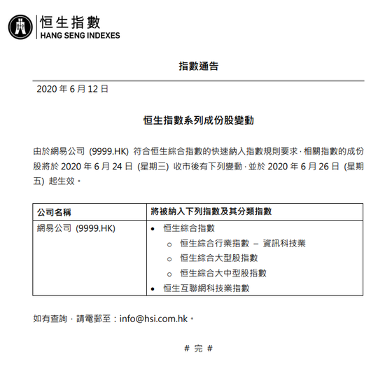 三言财经 6月12日消息,今日,恒指公司发布通告称,由于网易公司符合恒生综合指数的快速纳入指数规则要求,网易获调入恒生综合指数和恒生互联网科技业指数,并于2020年6月26日起生效。