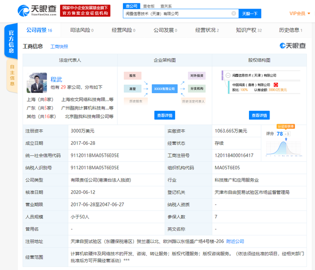 阅霆信息技术(天津)有限公司成立于2017年6月,注册资本3000万美元,公司经营范围包括计算机软硬件及网络技术的开发、咨询、转让服务;版权代理服务;版权咨询服务,由中国阅读(香港)有限公司100%持股。
