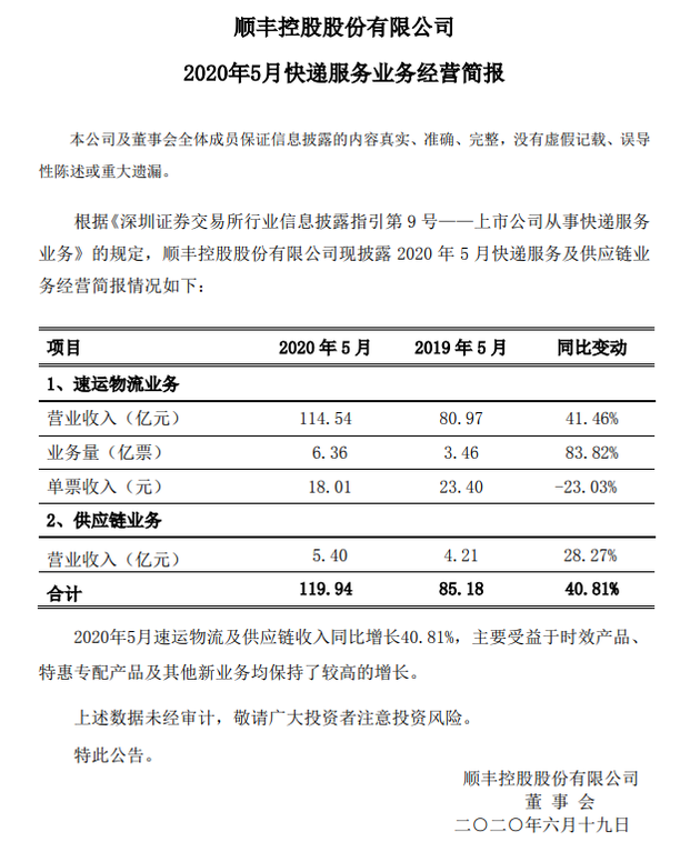 三言财经 6月18日消息,今日晚间,顺丰控股公告称,5月速运物流业务营业收入114.54亿元,同比增长41.46%;业务量6.36亿票,同比增长83.82%;单票收入18.01元,同比下降23.03%。
