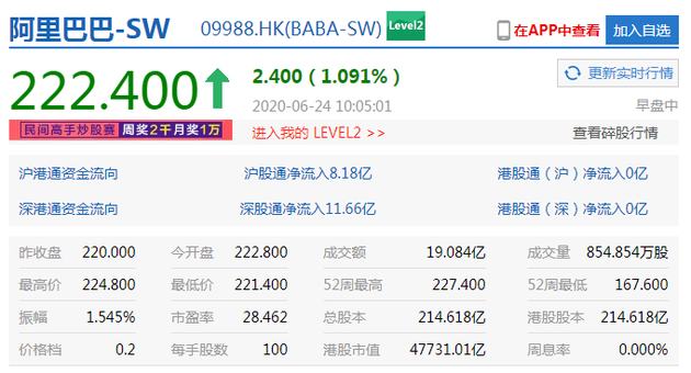 截至发稿,阿里巴巴涨1%报222.40港元,市值4.77万亿港元;腾讯涨0.04%报497.60港元,市值4.75万亿港元。