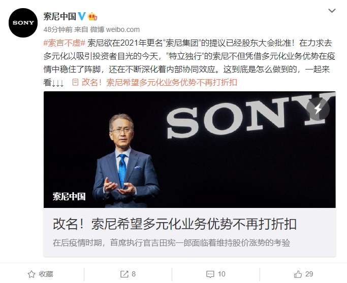 三言财经 7月2日消息,据索尼中国官方消息,在上周五的年度股东大会上,股东们批准了将公司名称改为“索尼集团”的提议,更名将于2021年4月生效。