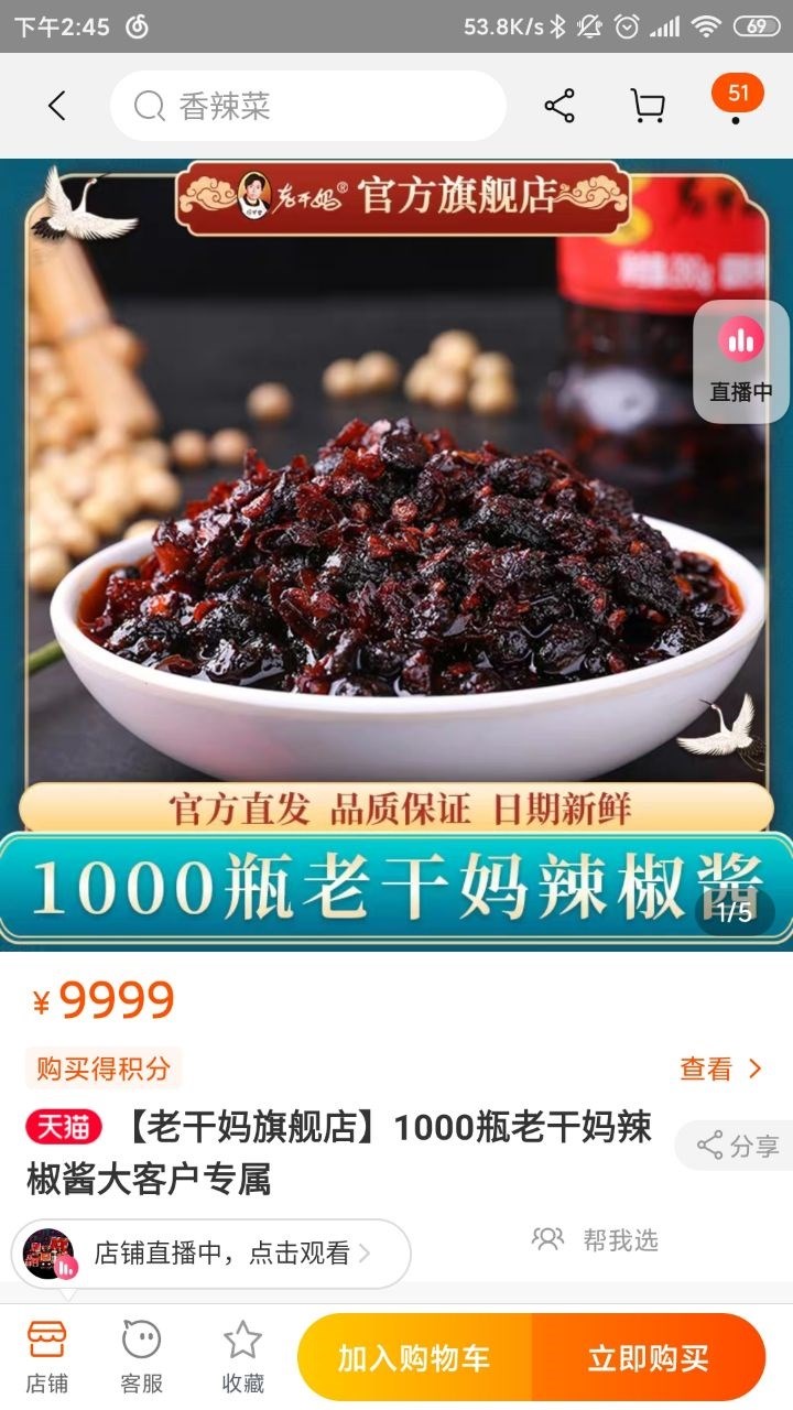 三言财经 7月2日消息,老干妈天猫官方旗舰店今日上线一个名为 “大客户专属”的 1000 瓶辣椒酱组合装产品,售价 9999 元,疑似在回应昨天腾讯的 “要买 1000 瓶辣椒酱”作为奖品征集线索。