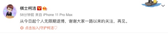 三言财经 7月5日消息,柯洁在其个人微博发文称,从今日起个人无限期退博,谢谢大家一路以来的关注,再见。