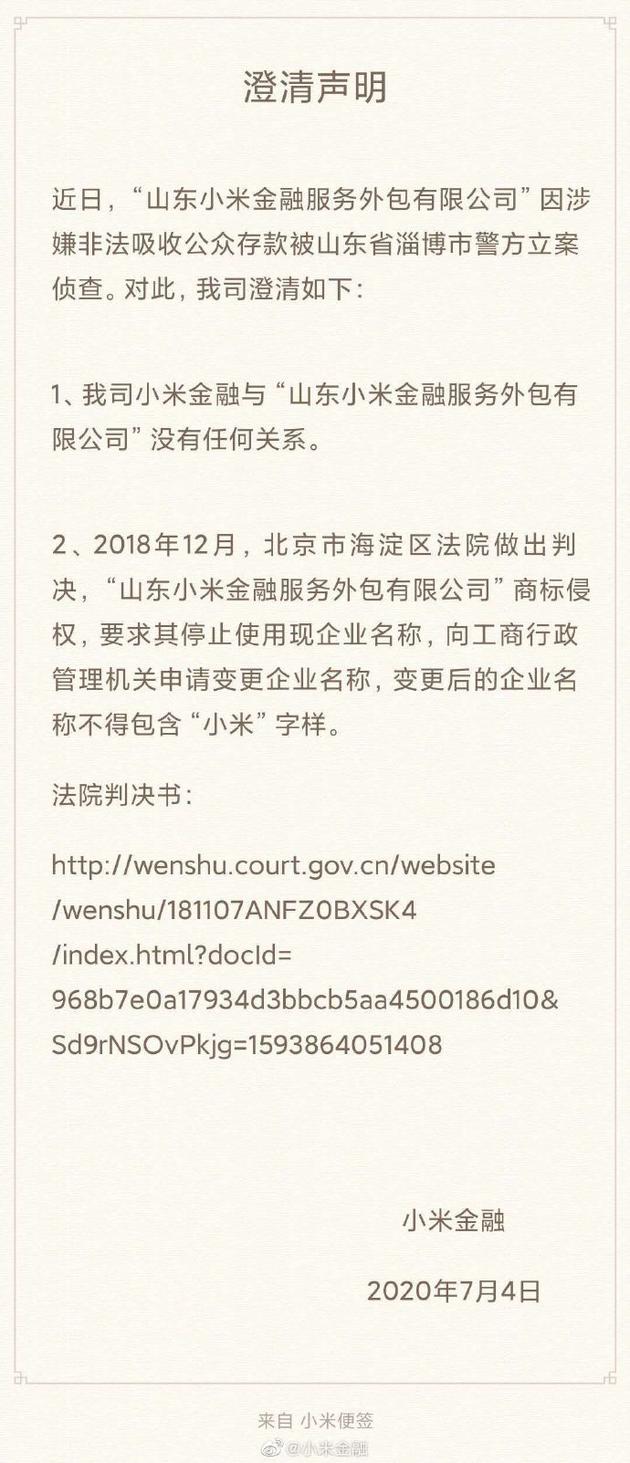 小米金融表示,2018年12月,北京市海淀区法院做出判决,“山东小米金融服务外包有限公司”商标侵权,要求其停止使用现企业名称,向工商行政管理机关申请变更企业名称,变更后的企业名称不得包含“小米”字样。