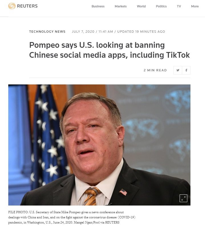三言财经 7月7日消息,据路透社报道,美国国务卿迈克 · 蓬佩奥(Mike Pompeo)周一晚间表示,美国 “肯定在考虑”禁止包括 TikTok 在内的中国社交媒体应用程序。