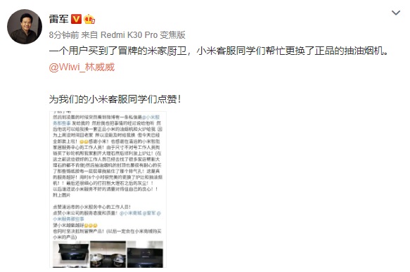 三言财经 7月9日消息,针对有消费者在京东上购买到了冒牌的米家厨卫,今日小米董事长兼 CEO 雷军表示,小米客服已帮忙更换了正品的抽油烟机。