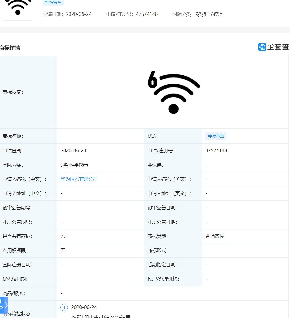 三言财经 7月15日消息,据企查查数据,华为于 6 月 24 日向国家知识产权局申请注册一个了了 Wi-Fi 6 图案相关的商标。目前该商标正处于等待审查状态,无法查询详细信息,仅了解到该商标是属于科学仪器分类。