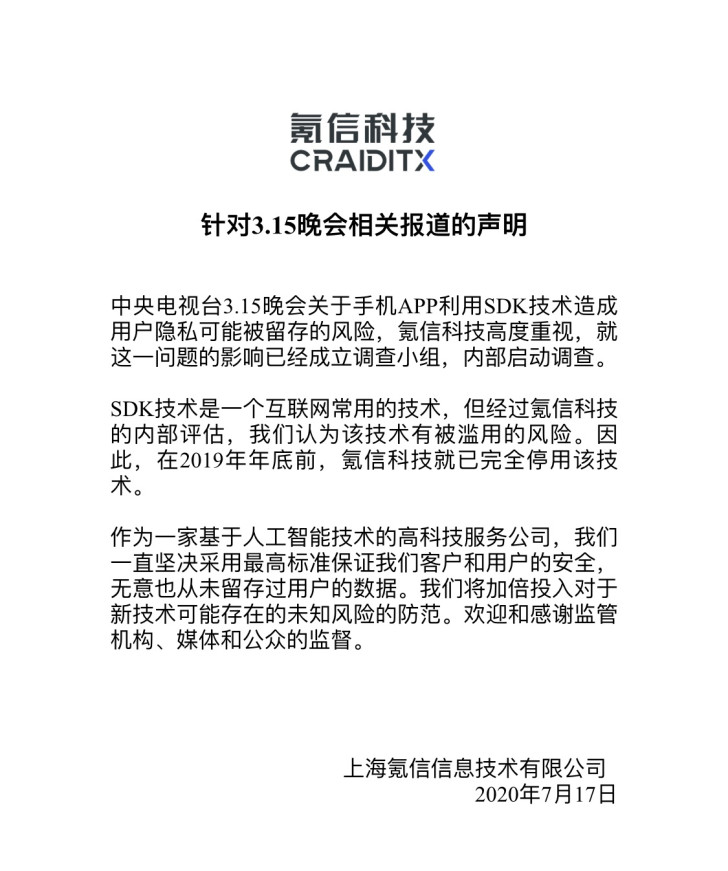 今日氪信针对该事件作出回应:3.15 晚会关于手机 APP 利用 SDK 技术造成用户隐私可能被留存的风险,氪信科技高度重视,就这一问题的影响已经成立调查小组,内部启动调查。此外,申明中提到,因内部评估 SDK 技术有被滥用的风险,在 2019 年年底前,氪信科技就已完全停用该技术。