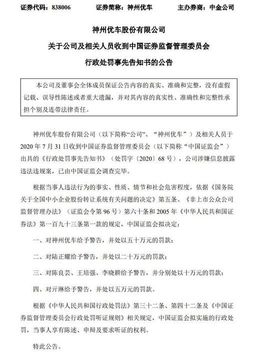三言财经 8月3日消息,神州租车在港交所公告,中国证监会已完成神州优车调查。中国证监会拟就神州优车涉嫌违反信息披露法律法规向神州优车发出警告及处以人民币50万元的罚款。