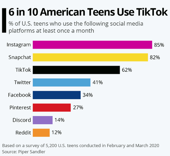 根据 2020 年春季进行的调查,超过 60% 的美国青少年至少一个月使用一次 TikTok,而使用 Twitter 和 Facebook 的比例分别为 41% 和 36%。