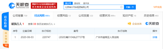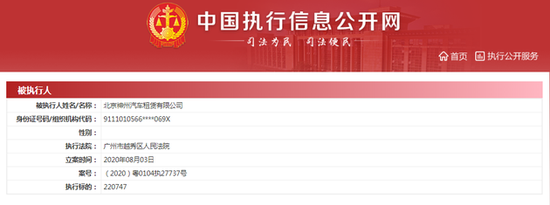 三言财经 8月4日消息,中国执行信息公开网显示,8月3日,北京神州汽车租赁有限公司被广州市越秀区人民法院列为被执行人,案号为(2020)粤0104执27737号,执行标的220747。