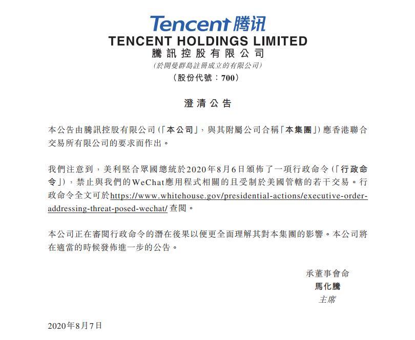三言财经 8月8日消息,8月7日晚间,腾讯控股在港交所发布澄清公告:我们注意到,美利坚合众国总统于2020年8月6日颁布了一项行政命令,禁止与我们的WeChat应用程式相关的且受制于美国管辖的若干交易。