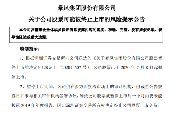 三言财经 8月10日消息,暴风集团公告,公司股票已于2020年7月8日起暂停上市。暂停上市期间,公司仍在多方面接洽市场上的审计机构,但截至公告披露日并未与相关审计机构签署协议,导致公司股票被暂停上市后一个月内仍未能披露2019年年度报告,因此深圳证券交易所有权决定终止公司股票上市交易。