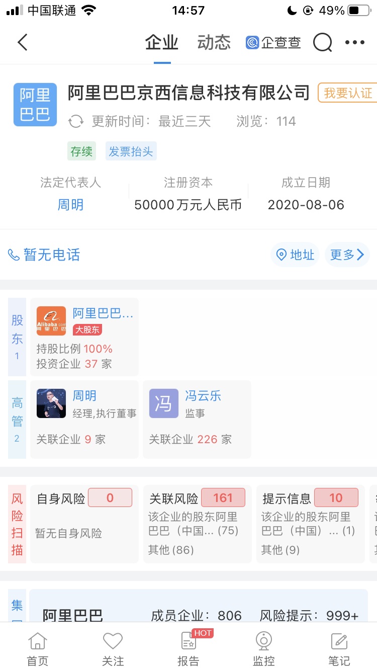 三言财经 8月10日消息,据企查查数据显示,8月6日,阿里巴巴京西信息科技有限公司成立,注册资金5亿人民币,法定代表人为周明,注册地址为河北省张家口市,公司经营范围包括电子元器件、电子产品、信息安全设备、计算机软硬件及辅助、网络设备、计算机及办公设备、制冷空调设备、电子专用设备、软件的销售、维修等,该公司由阿里巴巴(中国)有限公司全资持股。