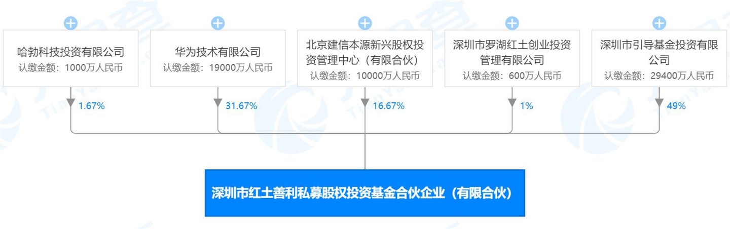 三言财经 8月13日消息,据天眼查信息显示,华为技术有限公司联合深圳市引导基金投资有限公司、北京建信本源新兴股权投资管理中心(有限合伙 )、哈勃科技投资有限公司(华为旗下)以及深圳市罗湖红土创业投资管理有限公司共同成立了深圳市红土善利私募股权投资基金合伙企业(有限合伙)。
