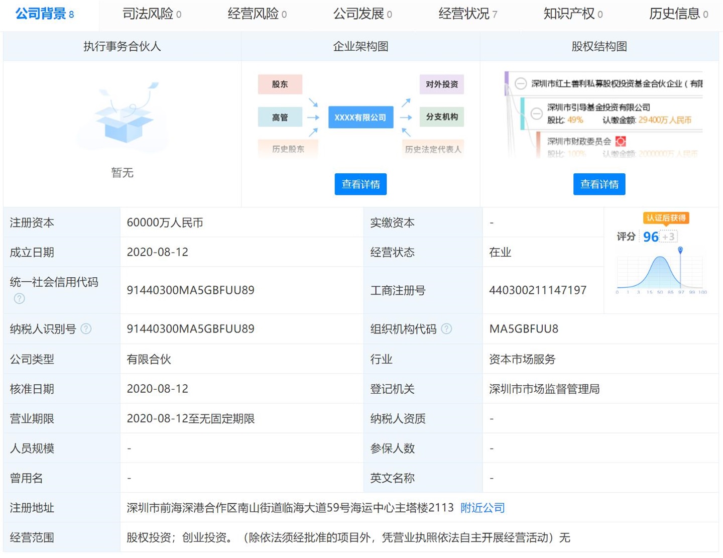 该基金公司成立于 2020 年 8 月 12 日,注册资本为 60000 万元人民币,大股东深圳市引导基金投资有限公司的疑似实际控制人为深圳市财政委员会,认缴金额 29400 万人民币,持股比例 49%。公司经营范围为股权投资;创业投资。