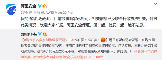 对此,阿里安全官方微博表示,目前涉事商家已处罚,相关信息已反映至行政执法机关。阿里安全保证,见一起,处罚一起,绝不姑息。