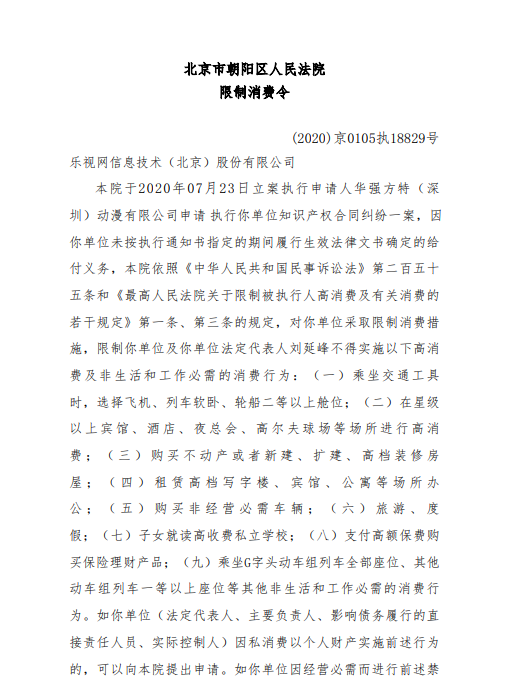 三言财经 8月23日消息,据中国执行信息公开网消息,近日,北京市朝阳区人民法院下发的(2020)京0105执18829号限制消费令显示,法院于2020年07月23日立案执行申请人华强方特(深圳)动漫有限公司申请执行乐视网信息技术(北京)股份有限公司知识产权合同纠纷一案,因乐视网信息技术(北京)股份有限公司未按执行通知书指定的期间履行生效法律文书确定的给付义务,法院依照相关规定,对乐视网信息技术(北京)股份有限公司采取限制消费措施,限制乐视网信息技术(北京)股份有限公司及法定代表人刘延峰不得实施以下高消费及非生活和工作必需的消费行为。