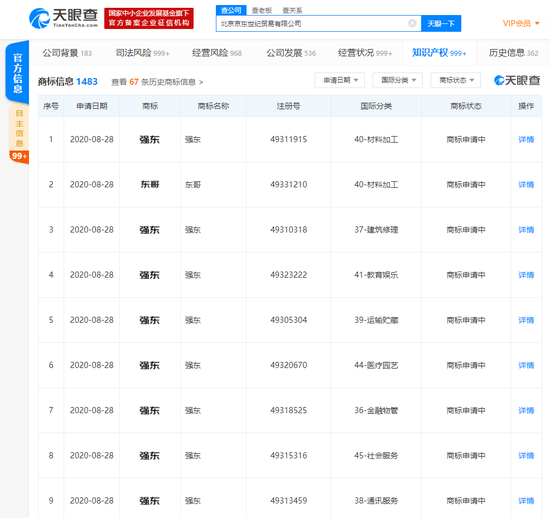 三言财经 9月16日消息天眼查App显示,近日,北京京东世纪贸易有限公司新增多条商标信息,其中包括多条“东哥”、“强东”的商标,申请日期在2020年8月28日,商标状态均显示为“商标申请中”。涉及国际分类包括材料加工、教育娱乐、建筑修理、运输贮藏、科学仪器、网站服务等。